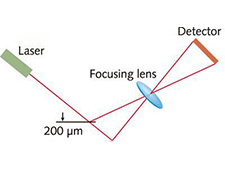 在激光三角檢測技術(shù)中,用一精細(xì)聚焦的激光束來掃描圓片表面,光學(xué)系統(tǒng)將反射的激光聚焦到探測器(圖1)。采用3D激光三角檢測術(shù)來檢測微凸點(diǎn)的形貌時(shí),在精度、速度和可檢測性等方面它具有明顯的優(yōu)勢。這一檢測技術(shù)目前所面臨的挑戰(zhàn)包括有凸點(diǎn)的尺寸和凸點(diǎn)之間的間隔都很小,以及在整個(gè)圓片上布滿有數(shù)百萬個(gè)凸點(diǎn)。