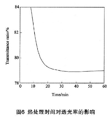 圖6為熱處理時(shí)間對(duì)ITO薄膜透光率(λ=550nm)的影響關(guān)系曲線。熱處理時(shí)間較短時(shí)ITO薄膜透光率較高,隨著熱處理時(shí)間的增加,ITO薄膜透光率隨之減小,當(dāng)熱處理時(shí)間超過15min后,隨著熱處理時(shí)間的增加,ITO薄膜的透光率下降緩慢,熱處理時(shí)間超過30min后ITO薄膜的透光率基本不隨著熱處理時(shí)間的增加而變化。