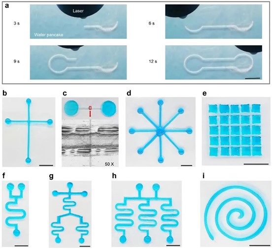 激光切水技術可以切割各種品類的微流控芯片,比如:十字交叉通道、分散型通道、陣列型通道、彎曲通道、集成型通道、螺旋通道等等,切割精度為350微米,證實了“激光切水”加工復雜微流控結構的能力。