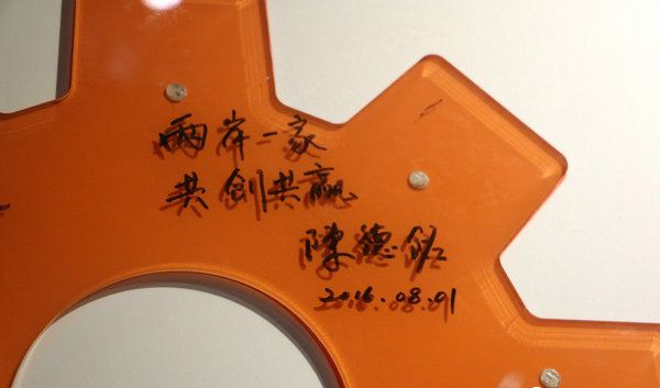 ▲.海峽兩岸關(guān)系協(xié)會會長陳德銘在活動現(xiàn)場題字“兩岸一家,共創(chuàng)共贏”