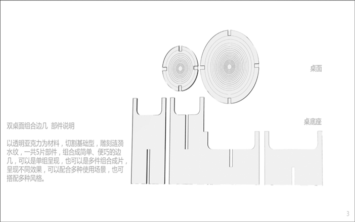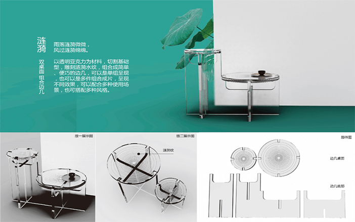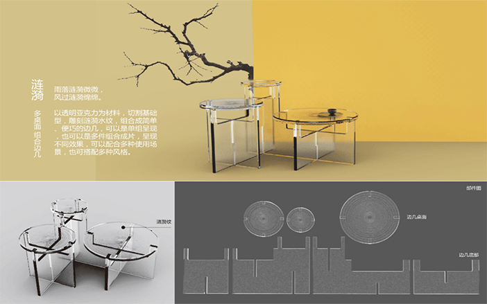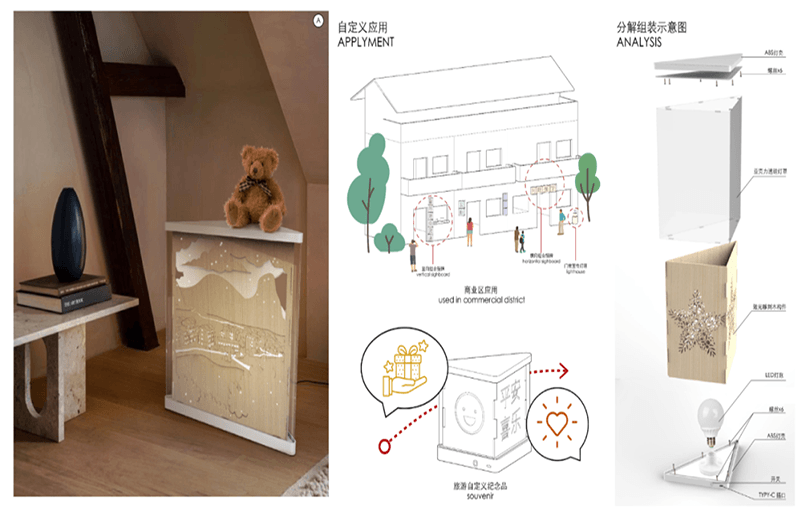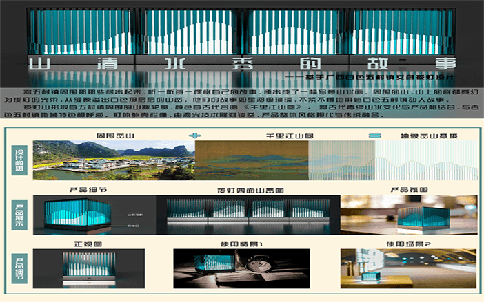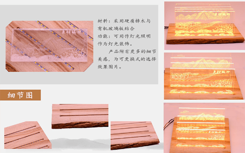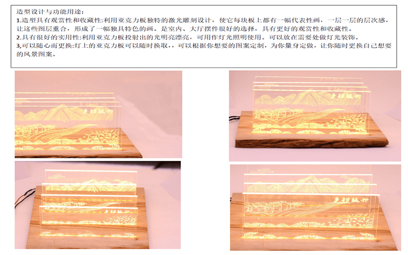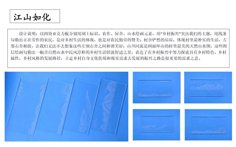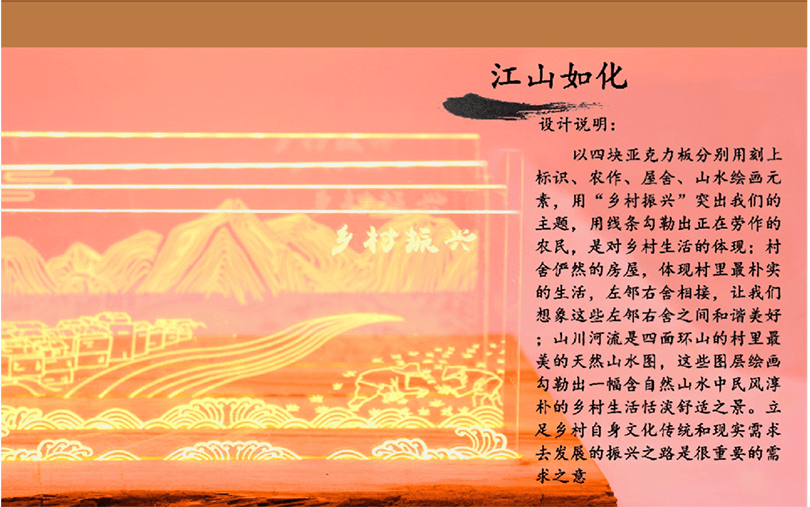 設計說明:四塊亞克力板上刻有標牌、農家、房屋和山水畫等元素。線條勾勒出農民和別墅,反映出簡單的鄉(xiāng)村生活。鄰里相見,表現(xiàn)出和諧美好的人際關系。山脈、河流代表了寧靜舒適的鄉(xiāng)村生活。根據(jù)自身的文化傳統(tǒng)和農村的實際需要,探索鄉(xiāng)村振興之路。