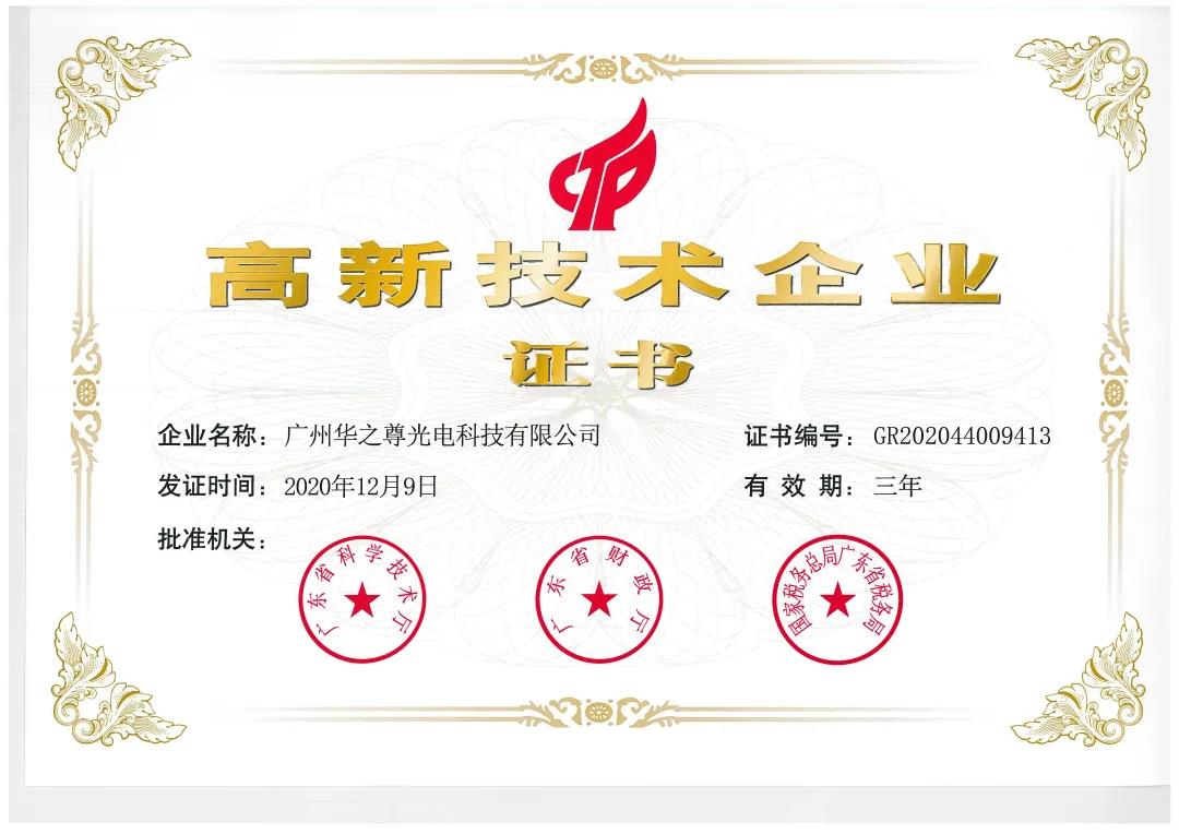 高新技術(shù)企業(yè)認定的評選條件十分嚴格。入選企業(yè)必須從事國家重點支持的戰(zhàn)略新興產(chǎn)業(yè),并在核心技術(shù)必須擁有自主知識產(chǎn)權(quán)、產(chǎn)品或服務(wù)屬于高新技術(shù)領(lǐng)域范圍、科技成果轉(zhuǎn)業(yè)能力、研發(fā)投入、科技人才占比、成長指標等方面達到相關(guān)標準。本次我司榮獲高新技術(shù)企業(yè)稱號,是對華之尊激光自成立以后發(fā)展成績的支持和肯定,也是客戶和社會各界人士對 廣州華之尊光電科技有限公司的關(guān)心和支持。