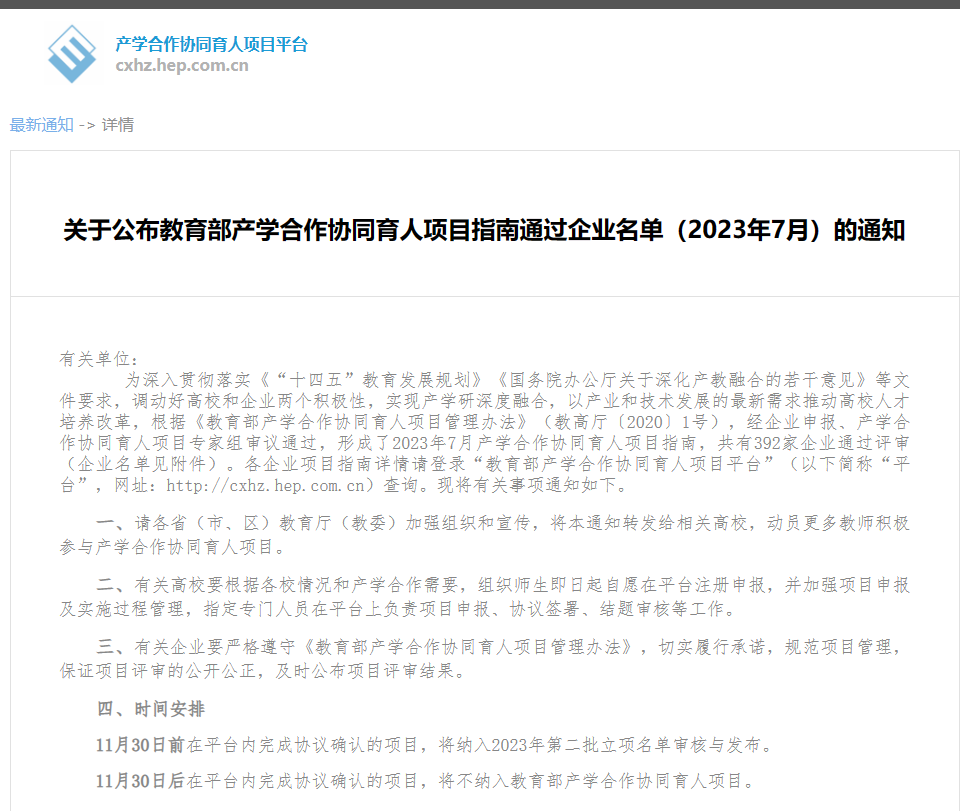 2023年11月30日后在平臺(tái)內(nèi)完成協(xié)議確認(rèn)的項(xiàng)目,將不納入教育部產(chǎn)學(xué)合作協(xié)同育人項(xiàng)目。